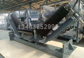 雙中輥調偏托輥組回轉軸焊在下橫梁上,回轉總成(包括組合軸承、回轉軸套)安裝在下橫梁上方,回轉總成外圍設計了可擺動的中托輥橫梁,以回轉軸為中心,在運行膠帶前、后中托輥橫梁上各設置一個中托輥,形成以回轉軸為中心的平衡支撐。側托輥采用加大軸承和軸徑設計,用側托輥軸代替常規(guī)的側托輥橫梁功能。側托輥可拆卸的安裝在兩中輥中間。側托輥為錐形輥設計,錐形輥采用鑄橡膠結構,其在膠帶跑偏時能產生較大的回向阻尼效果,從而使膠帶居中平穩(wěn)運行。